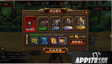 2、 每天每个玩家可以押运1次,每次可以被抢夺5次。在特定的时间内开启押运可以获得更多的奖励。押运时间为2小时。