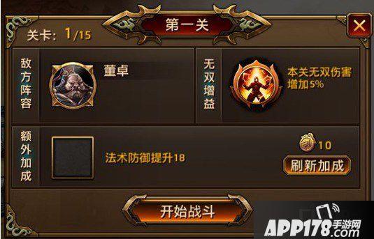 玩家可以查看敌方阵容、本关卡的无双增益、额外奖惩和通关后的奖励。