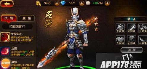 3.玩家可为名将穿戴装备以获取大量属性,穿齐装备时名将可进阶,并会吞噬所有装备,但同时也会获得所有属性。