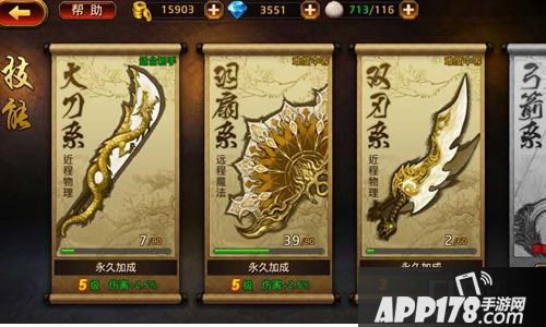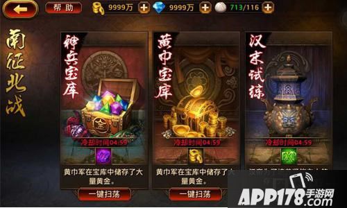 到达13级,南征北战玩法正式开启!南征北战共有黄巾宝库、神兵宝库和汉末试练三个副本。虽然13级开启的第一个副本神兵宝库并不能在等级提升方面给主公最直接的经验帮助,但是神兵宝库中产出的强化石却是主公提升自身装备所需要的重要材料。所谓“工欲善其事,必先利其器“,强力的装备能帮助主公更快的铲平宵小,斩获敌将,通关副本,提升等级!
