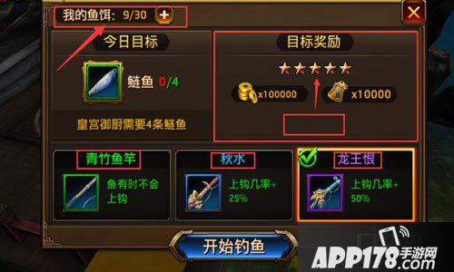 2、鱼钩选择:青竹、秋水(+25%几率)、龙王恨(+50%几率)三种竹竿任意选,后2种鱼竿购买以后可永久使用