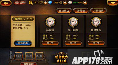 在竞技场界面玩家可以查看当前排名、战力和装备的武器。可以选择自己要挑战的对手