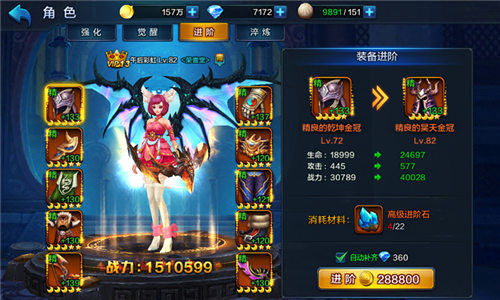 强化需要将其他闲置装备转化为经验提高装备的强化等级,可以大大的增强装备的基础属性。不用担心换装以后会血本无归,因为强化也是能够继承的。而觉醒则是用玄铁来进行升星,提升生命、攻击、战力等效果,每达到一定星数还会激活属性加成!当武器等级已经落后于人物等级的时候就可以使用进阶,将武器进阶到下一个等级,当然战力也是直线上升的!当然还能够使用淬炼石刷新装备的各项品质,直到你满意为止!
