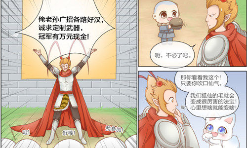 知名漫画家则贯彻了轻松萌动的画风和故事,可爱的小和尚和小狐狸热心地为大圣设计新武器,小狐狸的绒毛化作了玩具般的小双枪,闹出了令人忍俊不禁的笑话。而双枪在西游题材中可以说是非常穿越的设计了,脑洞满满,创意十足!倘若真的成为新版本的武器,相信会是一个非常值得期待的亮点!
