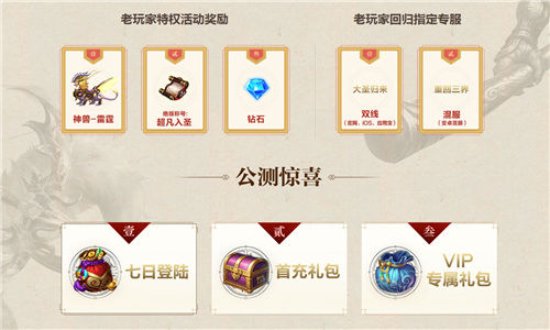 在《大圣之怒》6月9日全平台公测之际,官方也为众妖准备了丰厚的奖励,无论是新伙伴还是旧战友都将有海量礼包!6月15日将开启老玩家回归活动,只要进入专服即可获得极品神兽坐骑雷霆、限量绝版称号——超凡入圣以及大量的钻石,助你王者归来!而新玩家也将有七日登录送极品神将武器、首充礼包和VIP专属特权等好礼,必能战力无双、逆天斩神!此外,关注《大圣之怒》官方微信即有微信专属礼包相赠!发送双枪战斗截图至公众号更有双枪礼包,还不赶快参与!
