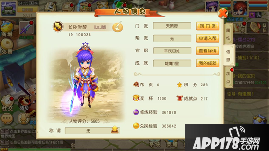 人物信息可查看到人物的官职、成就、帮派、称谓等信息。