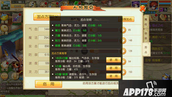 点击加点方案,再点击启用,玩家可自由加点。同时加点不满意也可以点击洗点,通过消耗掉一枚人参果,可重置全部的人物属性点(潜力点)。