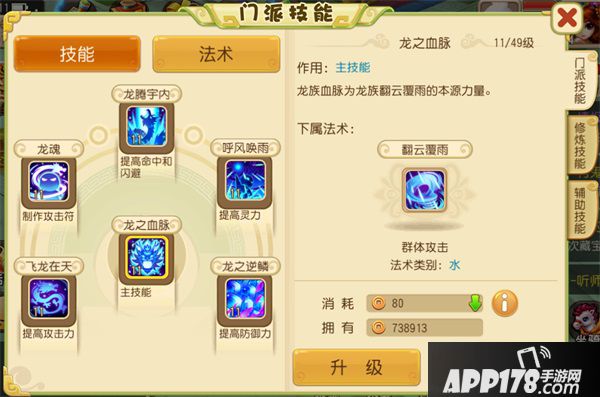 点击“技能”系统的功能按钮,就可以打开【技能界面】,默认是“门派技能”分页。不同的门派,门派技能也是不一样的。玩家可以看到所属门派职业的所有技能。点击技能,可以看到该技能的详细说明(包括技能的名称介绍、相关技能、升级需求等)。