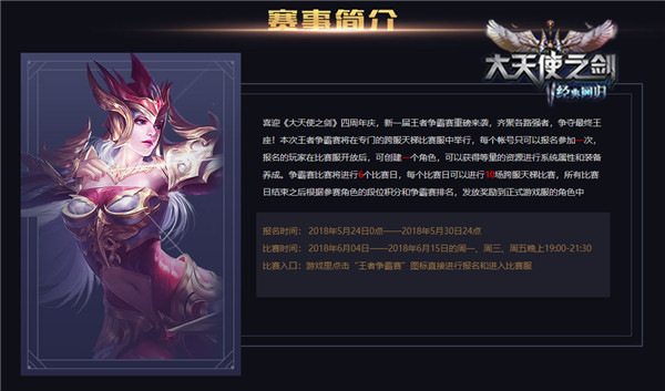 喜迎37《大天使之剑》四周年庆,新一届王者争霸赛重磅来袭,齐聚各路强者,争夺最终王座!本次王者争霸赛将在跨服天梯比赛服中举行,比赛时间为:6月4日-6月15日,每个账号只能报名参加一次,报名的玩家在比赛服开放后,可创建一个角色,同时还能获得等量的珍贵材料。
