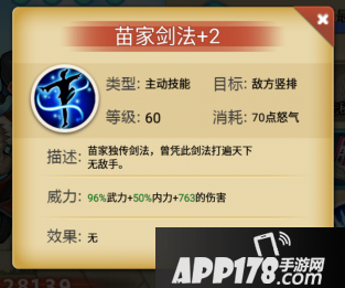 这是五星突破后的主动技能,可以看出内力和武力的加成平平,也没有攻击特效,耗费70怒气只能打竖排,这就注定了这个技能在实战中很难打到敌人的后排,也很难同时打到三个敌人。正是因为消耗高,攻击低,打不到后排,使得很多玩家放弃了对苗大侠的培养,甚至有的玩家首抽到苗大侠直呼点背要换区重练。