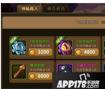 神秘商人这里可以购买到一些可以升级装备的碎片,以及开启宝藏类的需要的道具。但是每次售卖的道具都不一样哦,所以有心仪的碎片或道具就得赶快入手。而且每种道具每日可购买次数都是有限制的哦。