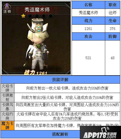 关于技能:主要以发射卡牌为主,单体和AOE都有,重要的是灼烧效果,这对于前面三个卡牌技能是很大的增幅,虽然几率有些低,但是好在法师的触发机会多。