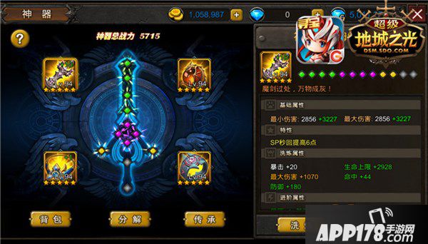 收集源石,进阶神器,天神属性强势附体!游戏中通过不断的进阶、洗练、提品将能让你的神器释放更强大的能量,同时神器传承与分解功能还将让你的神器培养之路更加轻松!在《超级地城之光》的无尽冒险旅程中,实力就是一切,而神器系统的加入,将让你明白实现战力爆表是件多么简单的事情。