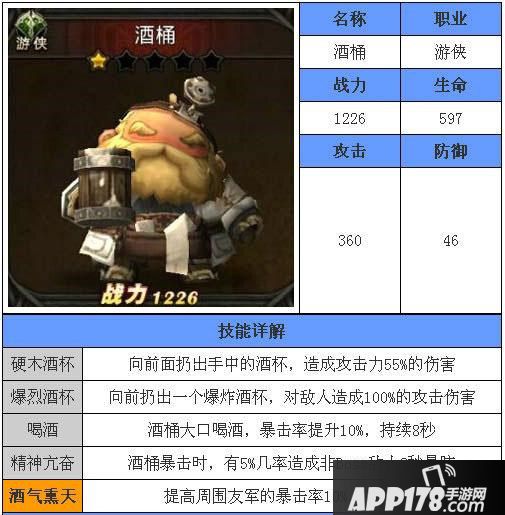 超级地城之光酒桶可显著提升暴击几率,酒桶这个战魂虽然是游侠,但是防御比暗影还要低,好歹你体型要大这么多,不要这么怂啊。有输出有控场有光环,这个战魂还是有培养价值的。