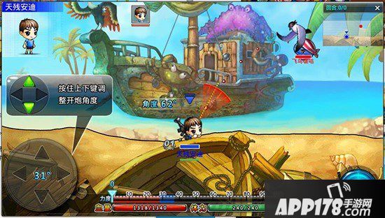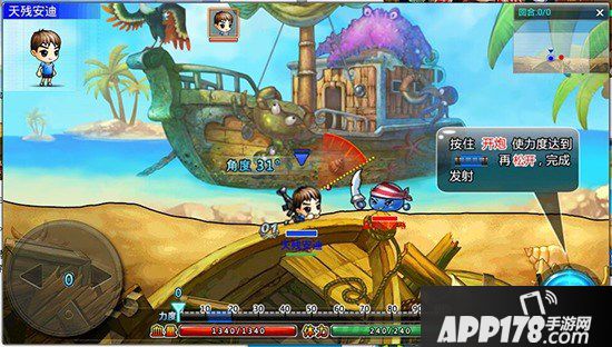 操作方式:按住右箭头,向武器移动,获得武器>>按住【开炮】使力度达到蓝色区域中时,松开【开炮】,完成发射