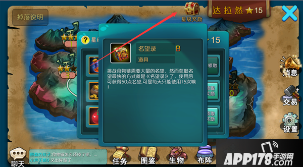 说到17层,一路打到17层会发现名望值不够,不允许打17层,那么我们必须回到冒险关卡通关星级宝箱传名誉值~