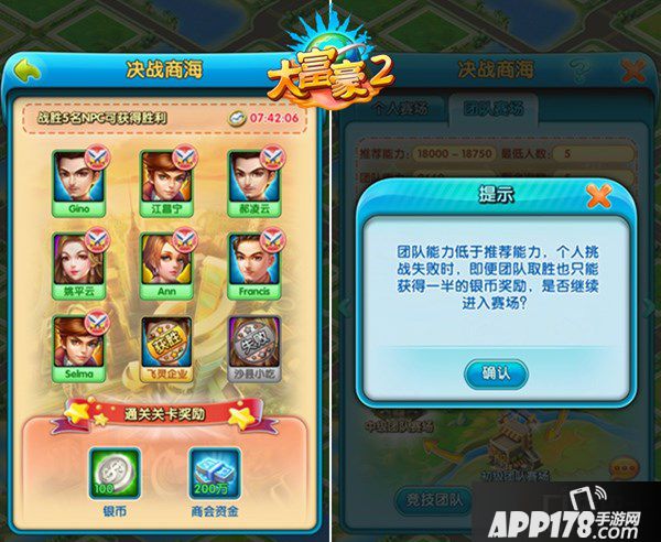《大富豪2》决战商海一共有两大副本,一是个人副本,另一个是团队副本。个人副本以各行各业为章节,每章节有五家公司需要通关,重要的是!除了每个关卡的重金奖励以外,通关每个行业章节还能领取大量金币和现金哦!游戏会给出各个行业的推荐挑战能力,若低于推荐能力失败几率会更大,导致浪费挑战次数,当然,若你是叶良辰的话,倒是可以另当别论啦!╮(╯▽╰)╭