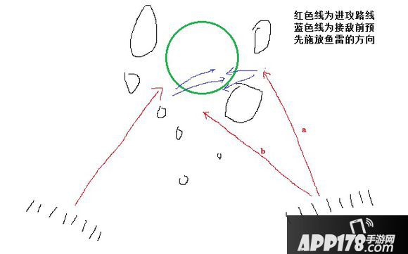 这个地图是适合占点的地图,双方的地形没有明显优劣势之别,我的话一上来是直冲棋点的,对那些一上来直冲对方出生点的勇士(SB)我一直是用敬仰的眼神来看的。左侧出生的话基本就一条路线,右侧有两条可选,推荐走保险的a线,技术好走位骚有自信的可以去b线拦截骚扰,有时会有出其不意的效果。为什么左侧没有b线,是因为对方的线路靠边,贸然走中间拦截不到对方,还容易被对方走在中间的战列舰集火一轮带走,而左侧路线旁边障碍较多,右侧出生点过去的话不容易被击杀。开局冲到棋点的圈外附近时就要向对方预先施放鱼雷,封锁对方的入口,左侧出生点是离圈还有大概2公里的位置,右侧出生点是刚绕过了火山,不管是否侦测到对方,先布置一个扇形的鱼雷阵,运气好会得到击杀,没有击杀也能让对方疲于应对给己方的大部队争取时间。