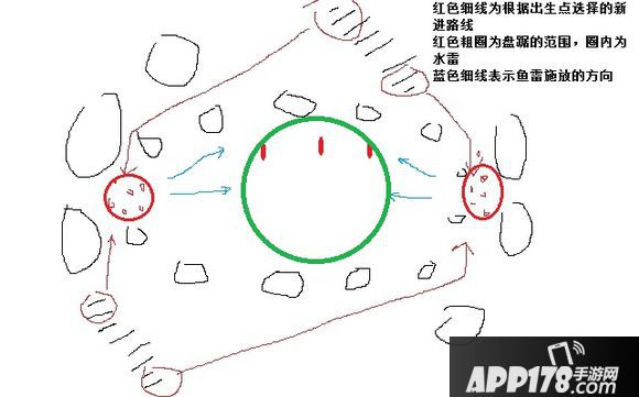 这个地图的边缘障碍物大概是个橄榄球状,这个地图的胜利一般靠的是实力,不靠占点,作为驱逐舰我是按照我方和对方的驱逐舰数量来决定打法,如果双方都是1-2驱逐,那么我就进圈但靠己方近一点不停绕圈,用主炮打对方驱逐,用鱼雷瞅空扔给对面战列或巡洋;如果双方驱逐多,我会到橄榄型的尖部位置,这个位置可以选择攻击对方在圈内驱逐的侧翼,正常情况下对方不会一来就注意到侧面的敌人,除非有良好的随时看小地图的习惯,侧面攻击的水雷经常有出其不意的效果;也可以选择直接插入对方阵地攻击对方战列,当然还会一路留下水雷。有时候在那呆久了,会满是我布的水雷,遇到从对方阵地过来找我的,我会边打边退,引诱对方踩雷。当然,如果队友不给力,中间迅速失守,还是得进去补位,棋点失守太久也会输的。