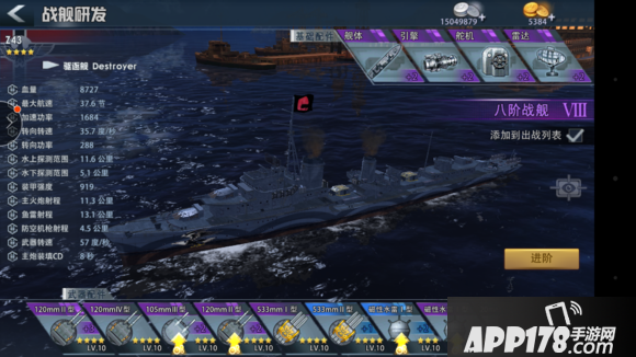 主要使用Z43,涂装类偏重侦测范围,涂装是活动给的暗夜图腾,水上侦测范围+0.5公里,最大航速0.3节,旗帜也是活动给的大英雄,主炮射程+0.4公里,装甲强度+200,贴花是飞鹰,水上侦测+0.2公里,偏重侦测在面对对方驱逐舰时可以取得先手,先手意味着一轮主炮(我的主炮伤害目前最低424,最高513)和先手鱼雷。
