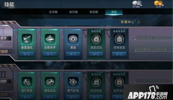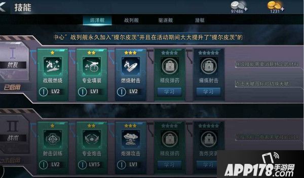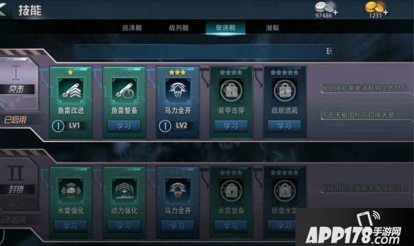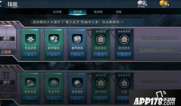在游戏的主界面就可以看到“技能”的按钮,每一种战舰都有两种独一无二的技能体系,升级到指定星级的军港,解锁对应星级的技能,如果在没有达到星级前要想使用高星级的技能,可以提前进行购买,那么下面咱们来看看不同战舰都有一些什么技能吧。