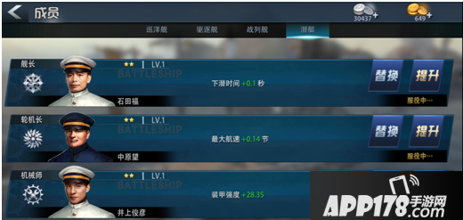 潜艇:强在隐匿和多鱼雷,弱在机动,如果想要进一步提升隐匿能力和鱼雷,可以对成员中的“舰长”“火炮手”来选择提升,如果想要弥补短板,那么可以对成员中的“轮机长”来进行提升,如果想要进一步提升辅助探测,可以对“通讯员”来进行提升。