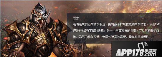 【职业属性】:高防高攻的近战物攻职业,拥有多个群攻技能和单攻技能,不论PVE还是PVP都有不错的表现,是一个全面发展的类型。又以其魁梧的体魄,霸气的动作深受广大男性玩家的喜爱。
