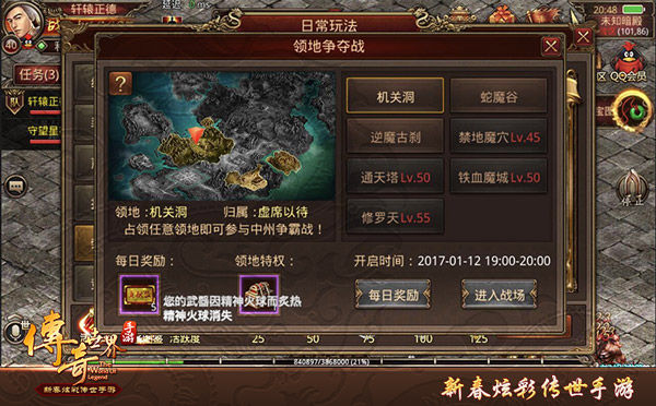 《传奇世界手游》为玩家们准备了超多趣味玩法,界面右上角的日常玩法将为玩家们梳理游戏中最新最全的特色玩法。今晚,玩家们期盼已久的领地争夺战将正式打响!