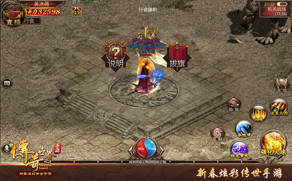 活动开启后,玩家可直接通过游戏界面右上方的分类选项进入战场。进入战场后,会长或者副会长就可以找到行会旗帜处进行抢夺旗帜,拔旗成功就会变成守旗方。而拥有旗帜的玩家移动速度会降低,各位勇士想要赢得最终胜利,就必须拼死守护旗帜超过10分钟。若是没能坚持住,旗帜便会回归原位,前功尽弃。