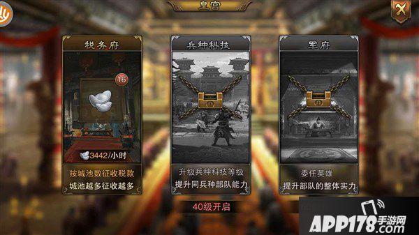 皇宫中可以领到税收银两,达到一定级数之后,就能升级兵种科技和军府,提升所有武将的实力。