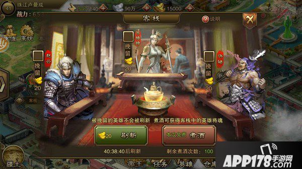陛下进了游戏之后,最应该熟悉的地点应该是酒馆和客栈,用来招将和将魂。酒馆每天都有免费招将次数。达到一定级数之后,就可以开启客栈刷将模式,锁定你想要的武将,刷刷刷将魂滚滚来啊!