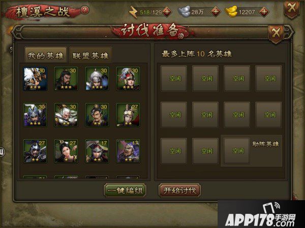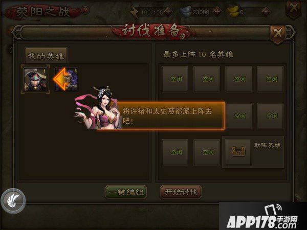 注意!此时就需要您开始思考“策略”了!一个城只能上10个将,所以上阵时既要考虑前排后排武将的搭档,又要考虑到讨伐过程中阵亡武将的替补。