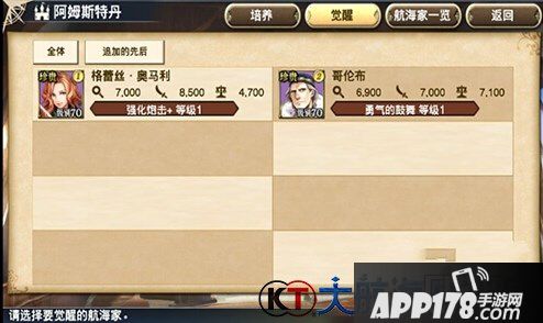 当海员的等级达到上限的时候,就可以使用和其相同的海员卡牌来进行”觉醒“啦。进入菜单页面,单击【培养】,在培养界面选择右上角【觉醒】功能。