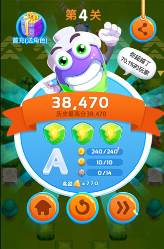 在结算界面方面,本关总共有240颗金币,10颗能量球以及14只怪物,特别是怪物部分数量较大,鉴于本关使用的是“贝克汉.磁”,所以尽量使用闪电等道具来摧毁怪物。当然这是对于想要获得高分的玩家所追求的目标,普通玩家即使一只怪物都没有杀也会有A级的评价,建议可以等后期道具多一点再来重新挑战该关卡。