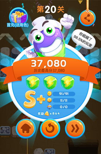 在结算界面方面,本关共有91个金币,11颗小能量球,而且并没有怪物,所以本关要获得高分非常容易,主要还是要躲开激光即可,金币也都是藏于激光塔内,敢上就能高分,挑战玩家胆识的时候到了。