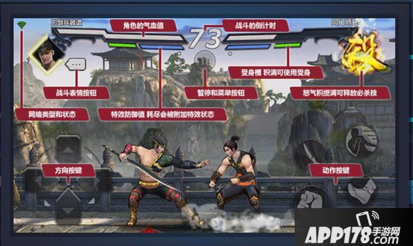 刀剑兵器谱手游采用虚拟按键操作,可以外接手柄。左下角是方向键,前后,下蹲和跳跃键。