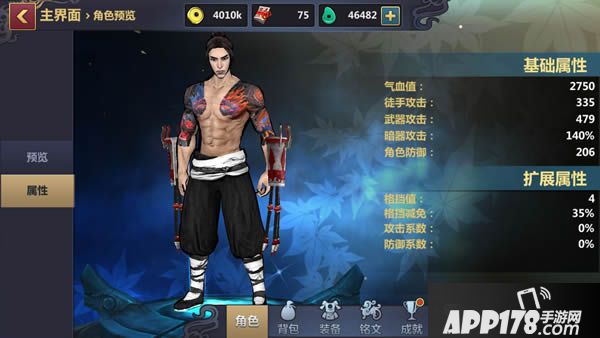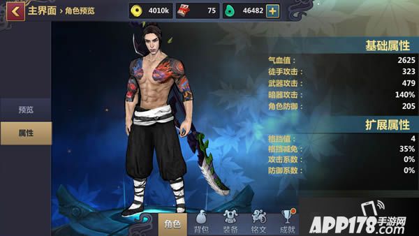 基础属性有:气血值,徒手攻击力,武器攻击力,暗器攻击力和角色防御。气血值随等级提升,升一级加125点,徒手攻击力也是随等级提升,不受装备影响,升一级加12点,影响暗器和腿技能的伤害。武器攻击力需要通过强化来提升,影响拳技能伤害。角色防御加了防具的防御值,每升一级加1点。