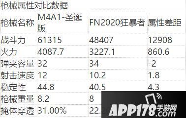 从属性来看战斗力上M4A1-圣诞版相比FN2020狂暴者,我们的M4A1-圣诞版高出了FN2020狂暴者12908,火力上M4A1-圣诞版相比FN2020狂暴者,M4A1-圣诞版高出了860.6,弹夹容量FN2020狂暴者都出了两发。射击速度两把枪械相差不多,稳定性M4A1-圣诞版高出了FN2020狂暴者4.3,枪械重量两把枪械相差不多,掩体穿透M4A1-圣诞版高出了8.8%。从属性上来看M4A1-圣诞版略胜一筹。