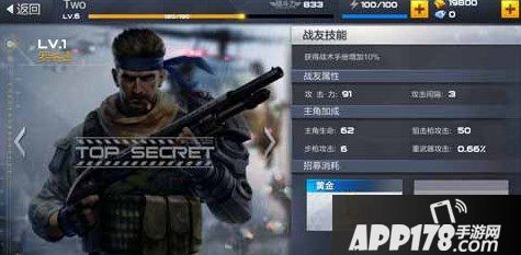 主角加成:生命62、狙击枪攻击50、步枪攻击6、重武器攻击0.66%。目前玩家需要消耗2W金币就可以得到这个战友,不过招募要求需要主角人物军衔等级达到中士1,所以大家平常也要注意主角的培养哦。我建议大家尽量在最短的时间内得到这个战友,因为战友在战斗中对我们的帮助作用是巨大的。