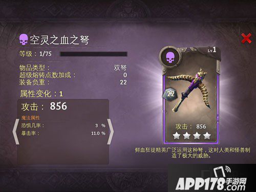 地牢猎手5 死亡属性四星双弩图鉴介绍!地牢猎手5是一款非常好玩的手机游戏,在这款游戏中我们可以选择五种武器,每一种武器有着各自不同的特点,每一种属性也有着各自不同的特点,今天APP178手游小编给大家带来的是死亡属性四星双弩的图鉴,双弩是远程高攻速的代表,配上死亡属性的恐惧效果,详细肯定会让很多朋友都满意的!