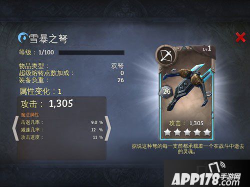 地牢猎手5寒冰属性5星双弩图鉴介绍!地牢猎手5是一款非常好玩的手机游戏,在这款游戏中一共有五种装备,其中法杖和双弩是远程的武器,剩下的是近战。今天APP178手游小编给大家带来寒冰属性5星双弩的攻略,下面我们一起来看看吧!