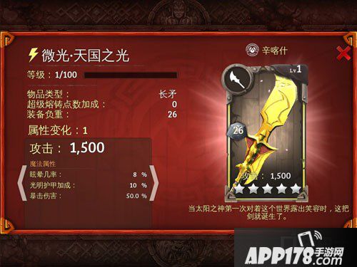 地牢猎手5新版本装备介绍!地牢猎手5是一款非常好玩的手机游戏,这款游戏在昨天更新了自己的全新版本,在这个版本中出现了全新的武器和护甲,今天APP178手游小编就来给大家带来新版本中微光天国之光的武器的图鉴,希望大家喜欢!