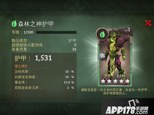 地牢猎手5森林之神护甲图鉴介绍!森林之神护甲好用么?地牢猎手5是一款非常好玩的手机游戏,在这款游戏中有着大量的装备可供我们选择,今天APP178手游小编给大家带来这款游戏中五星自然属性森林之神护甲的图鉴,希望大家喜欢~