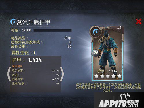 地牢猎手5水属性蒸汽升腾护甲图鉴介绍!地牢猎手5是一款非常好玩的手机游戏,在这款游戏中一共有五种属性,每一种属性都有自己不同的装备,今天APP178手游小编给大家带来的是水属性蒸汽升腾护甲图鉴,希望大家喜欢!
