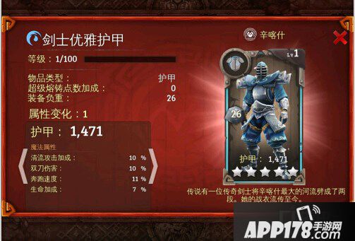 地牢猎手5剑士优雅护甲图鉴介绍!地牢猎手5终于更新啦,这次的更新版本中全新内容包括,仆从,武器,护甲,下面就让我APP178手游小编给大家说说今天要介绍的这款,希望可以让你喜欢!