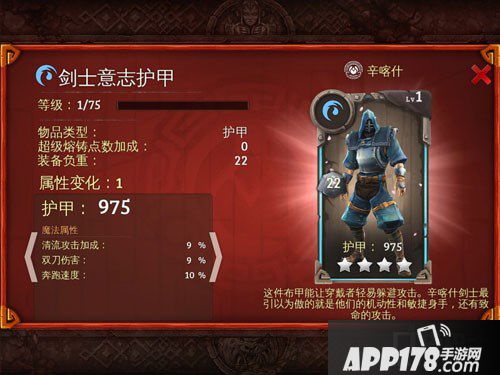 地牢猎手5装备介绍!地牢猎手5是一款非常好玩的手机游戏,这款游戏在昨天更新了自己的全新版本,在这个版本中出现了全新的武器和护甲,今天APP178手游小编就来给大家带来新版本中剑士意志护甲图鉴,希望大家喜欢!