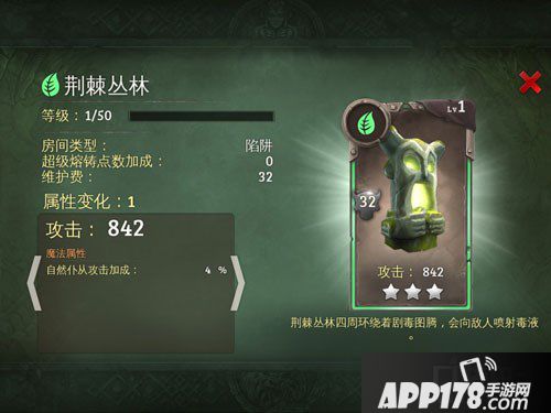 地牢猎手5荆棘丛林陷阱介绍!地牢猎手5是一款非常好玩的手机游戏,这款游戏在最近更新出了新的版本,版本内加入了陷阱这一玩法,今天APP178手游小编暴走的脂肪给大家带来这个版本中自然属性陷阱荆棘丛林的图鉴介绍,希望大家喜欢!