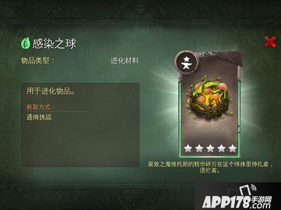 地牢猎手5进化材料感染之球介绍!在地牢猎手中,我们升级专属通缉装备时候需要用到这个材料,任何一个光明属性的装备的和大部分其他属性的装备都需要这个家伙。下面APP178手游小编就来给大家说说这件感染之球的图鉴介绍。