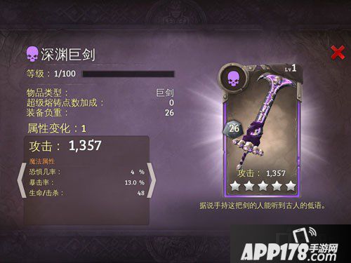 地牢猎手5死亡属性五星巨剑图鉴介绍!地牢猎手5是一款非常好玩的手机游戏,在这款游戏中有着大量的装备可以供我们选择,今天APP178手游小编给大家带来这款游戏中的五星死亡属性巨剑的图鉴介绍,希望大家喜欢!