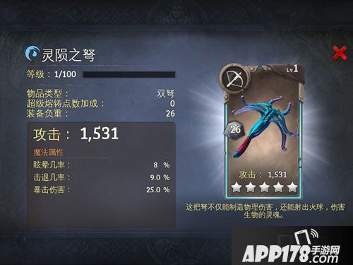 地牢猎手5水属性灵陨之弩图鉴介绍!地牢猎手5是一款非常好玩的手机游戏,在这款游戏中一共有五种属性,每一种属性都有自己不同的装备,今天APP178手游小编给大家带来的是水属性灵陨之弩图鉴,希望大家喜欢!